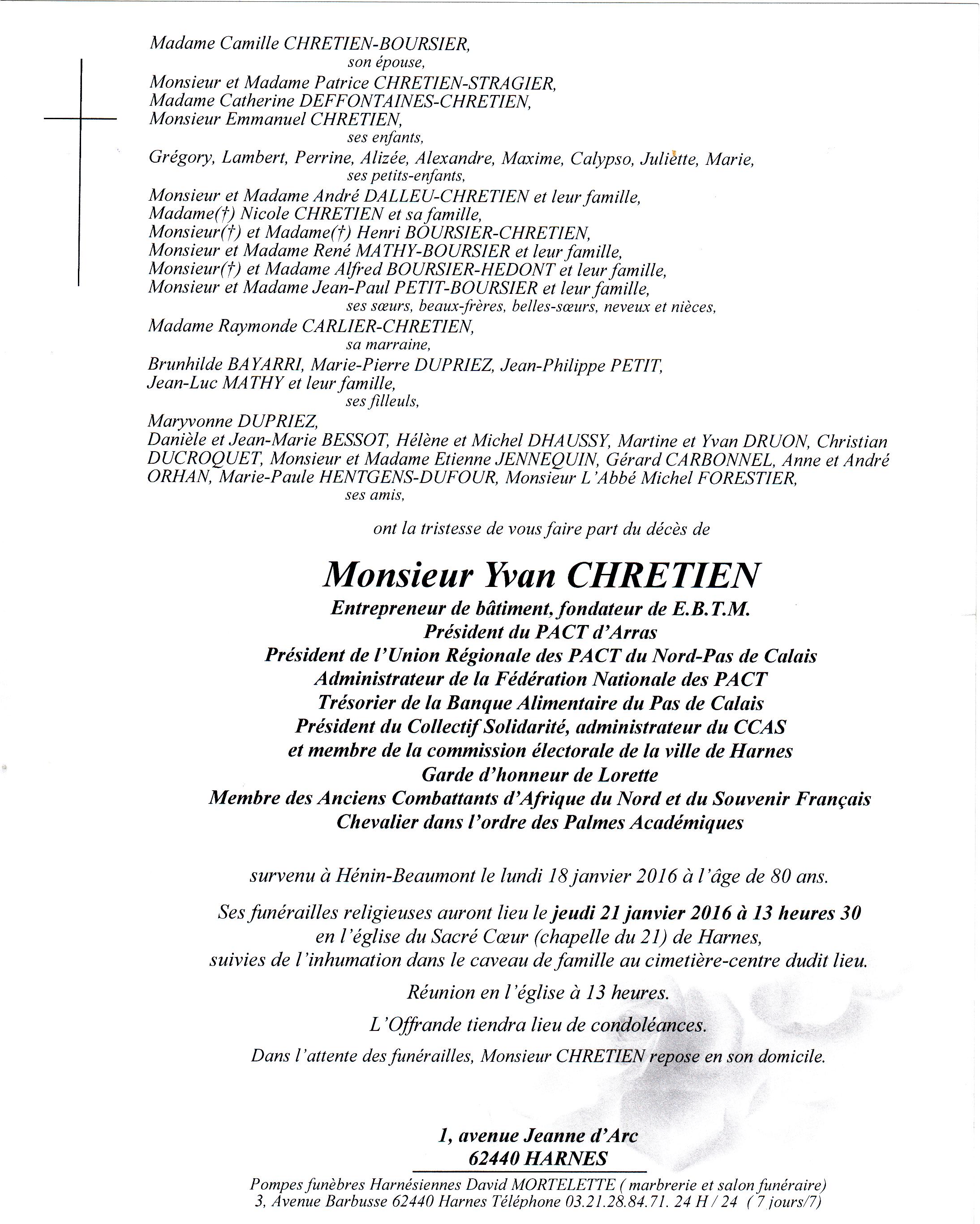 HARNES a perdu un Grand Monsieur en la personne de MONSIEUR YVAN CHRETIEN qui s’est investi, pendant de très nombreuses années, dans une démarche totalement désintéressée, au service de l’Humain.