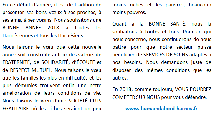 En ce début d’année, il est de tradition de présenter ses bons vœux à ses proches, à ses amis, à ses voisins. Nous souhaitons une BONNE ANNÉE 2018 à toutes les Harnésiennes et tous les Harnésiens.